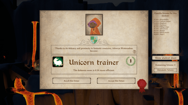 - Push your students towards a glorious future. At the end of their studies, you discover their future (necromancer, archimage, peasant…) depending on the success of their studies, and earn new bonuses.